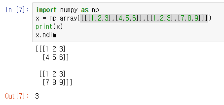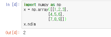 그렇다면 마지막으로 tensor입니다. matrix의 집합인 tensor는 당연히 3차원 부터 시작하니 최소 3이상의 수가 나올 것입니다. 저는 3d 텐서를 입력값으로 넣었으니 3이라는 수가 출력될 것입니다.